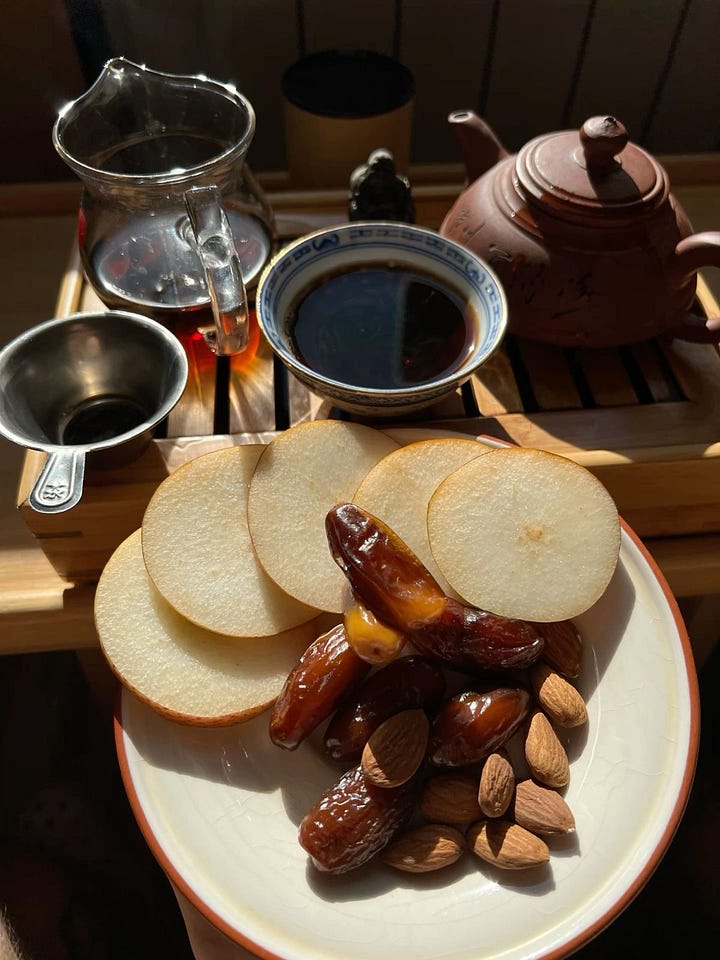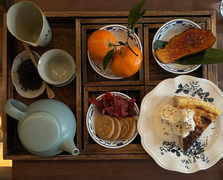 maybe your tray is green tea with sliced apple and a square of dark chocolate. maybe it’s hojicha with roasted sweet potato in the fall. maybe it’s earl grey with warm milk and a cookie after a long day. maybe it’s just jasmine tea and a handful of almonds.